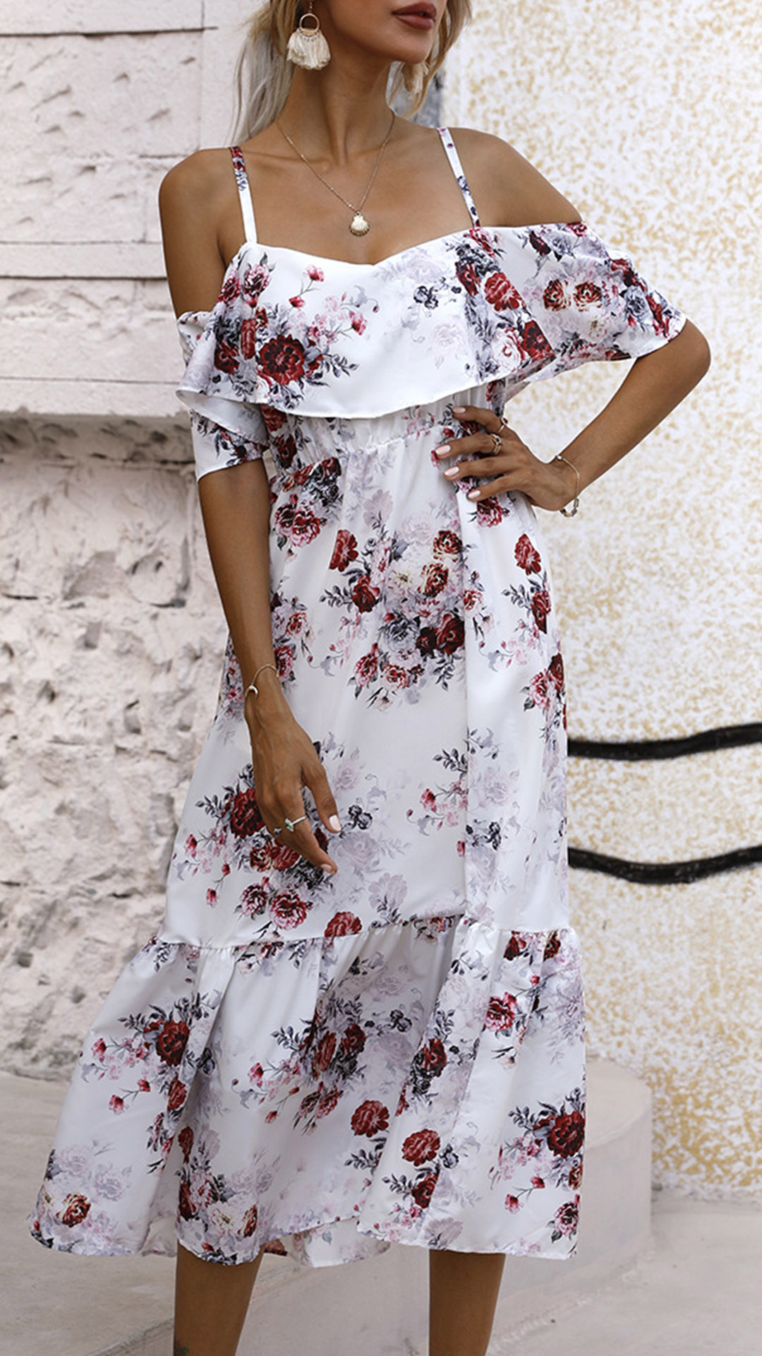 This Floral Printed Dress is perfect for any summer occasion! The ruffled tiers add a touch of femininity, while the open shoulders give this dress a sexy edge. The floral print is perfect for a summer garden party or a day at the beach.