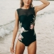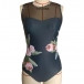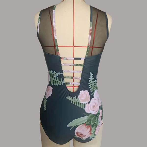Sexy Floral Printed Semi-through Gauze Spliced Round Neck Sleeveless Backless One-piece Swimsuit/Monokini