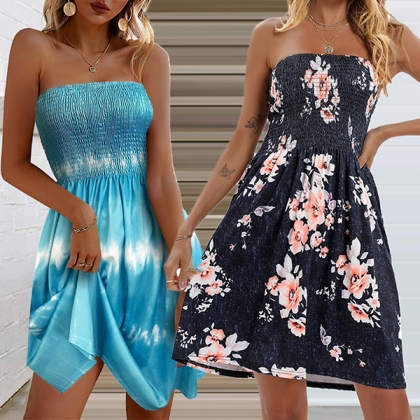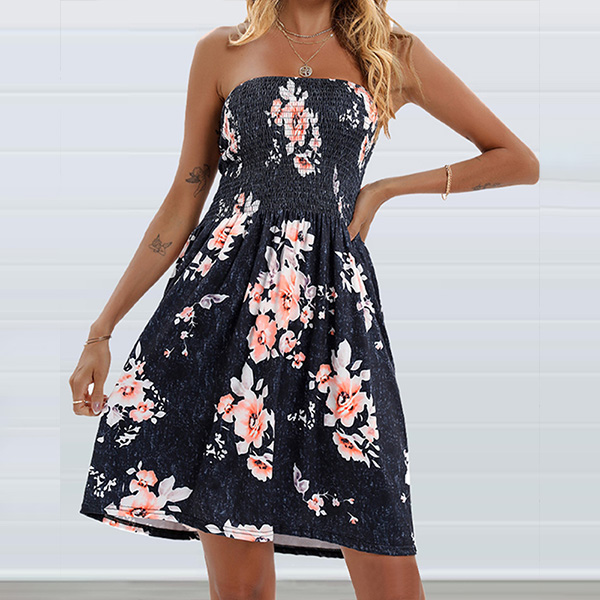 Sexy Floral Printed Smocked Strapless Mini Dress