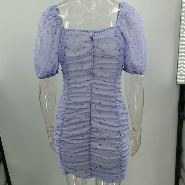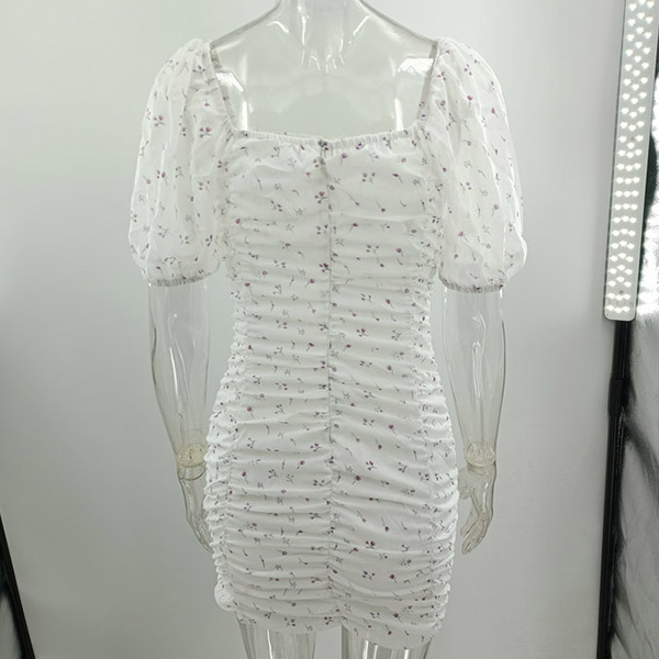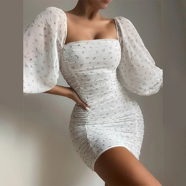 Sexy Floral Printed Square Neck Puff Short Sleeve Ruched Bodycon Dress