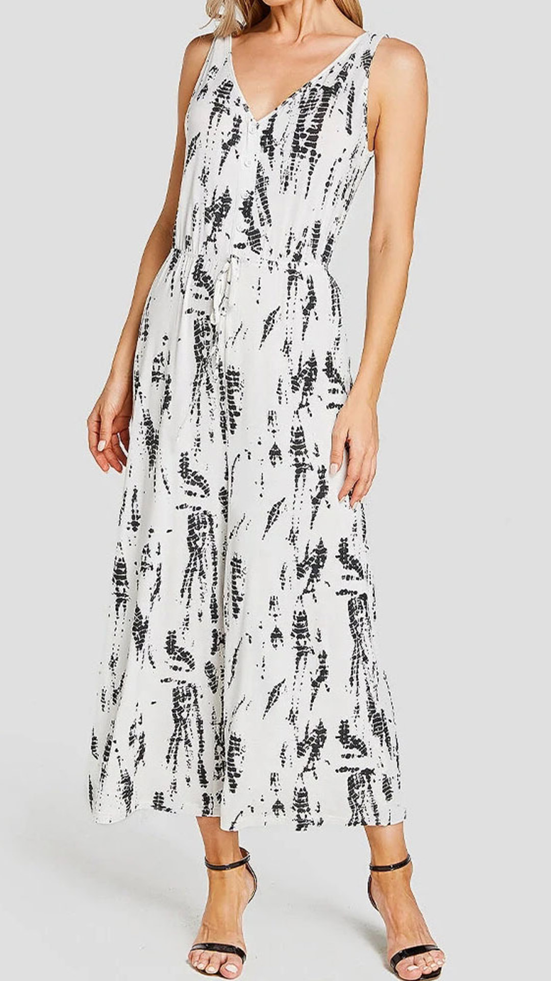 This jumpsuit is perfect for a summer day! It features a floral print, a v-neckline, a sleeveless design, and a wide-leg silhouette. Pair it with some strappy sandals and a sunhat for a complete look.