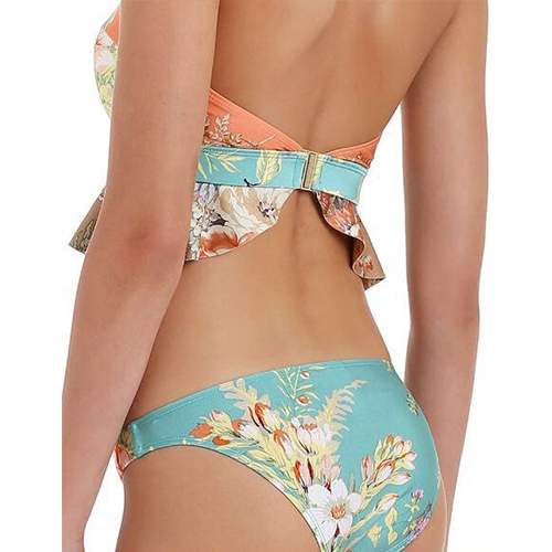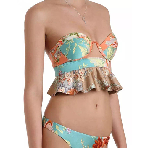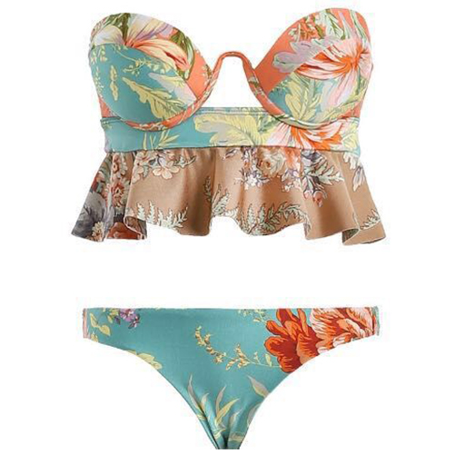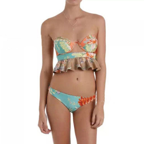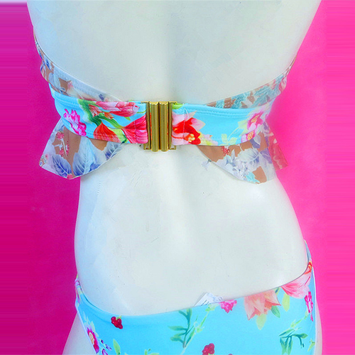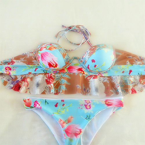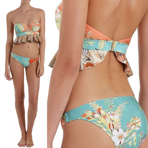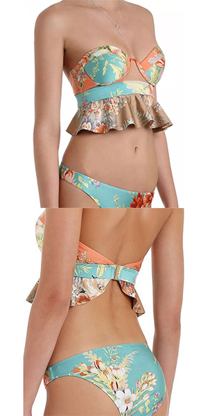 Its bandeau bra with flouncing and detachable shoulder strap design. This swimwear set is perfect