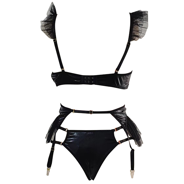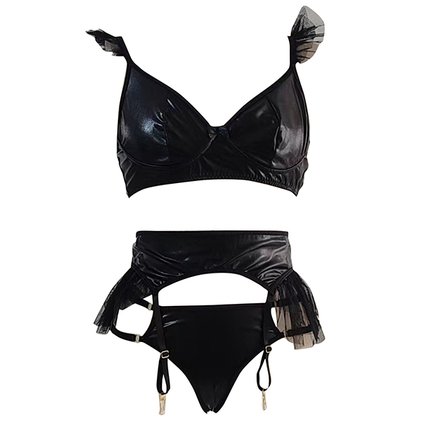 Sexy Gauze Spliced Artificial Leather PU Three-piece Lingerie Set