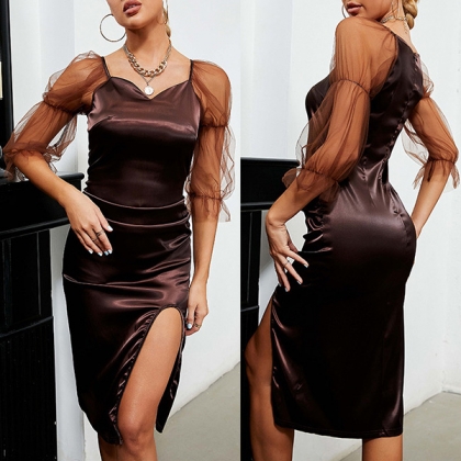 When invited to a party or gathering,you can trust in this dress to be the focus. The gauze spliced half sleeve,v-neck and slit hem design make this piece look so sexy and alluring,while the fit silhouette design can showcase your slender figure. Dress it up with your sexy heels and elegant clutch,you can look stunning enough!