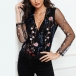 Sexy Gauze Spliced Long Sleeve Deep V-neck Embroidered Top