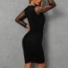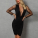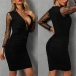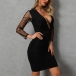 Sexy Gauze Spliced Long Sleeve Deep V-neck Slim Fit Dress