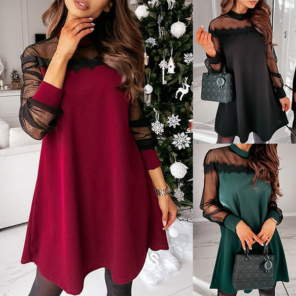 Sexy Gauze Spliced Long Sleeve Mock Neck Loose Dress