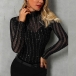 Sexy Gauze Spliced Long Sleeve Mock Neck Slim Fit Top