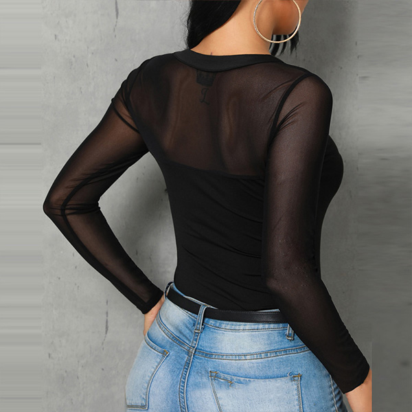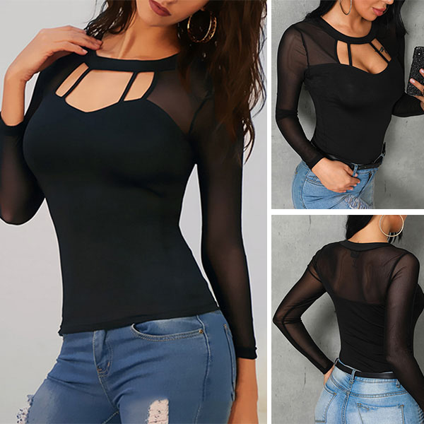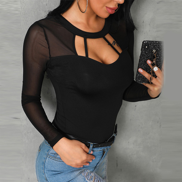 Sexy Gauze Spliced Long Sleeve Round Neck Hollow Out T-shirt
