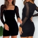 Sexy Gauze Spliced Long Sleeve Ruched Black Dress