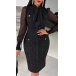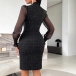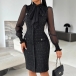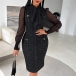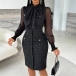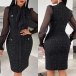 Sexy Gauze Spliced Long Sleeve Self-tie Neckline Double-breasted Bodycon Dress