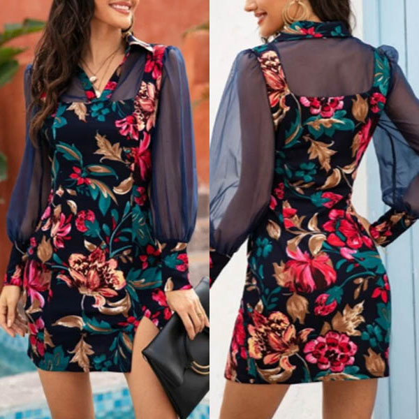Sexy Gauze Spliced Long Sleeve Slit Hem Slim Fit Printed Dress