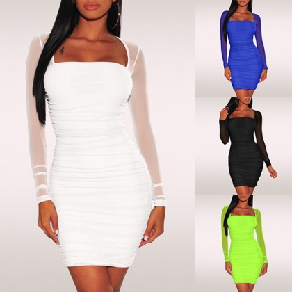 Sexy Gauze Spliced Long Sleeve Square Collar Slim Fit Dress