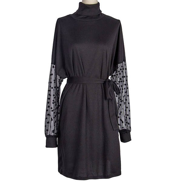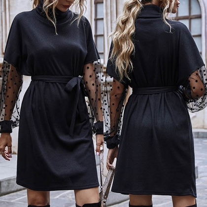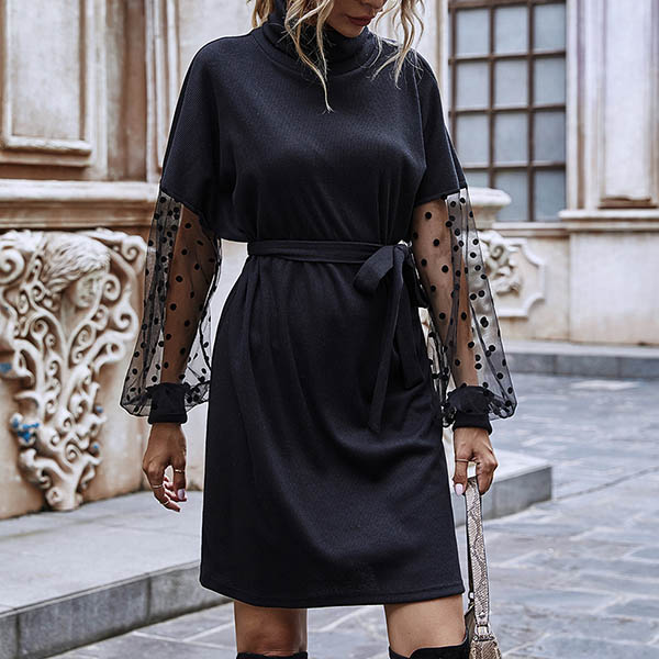 Sexy Gauze Spliced Long Sleeve Turtleneck Slim Fit Dress