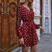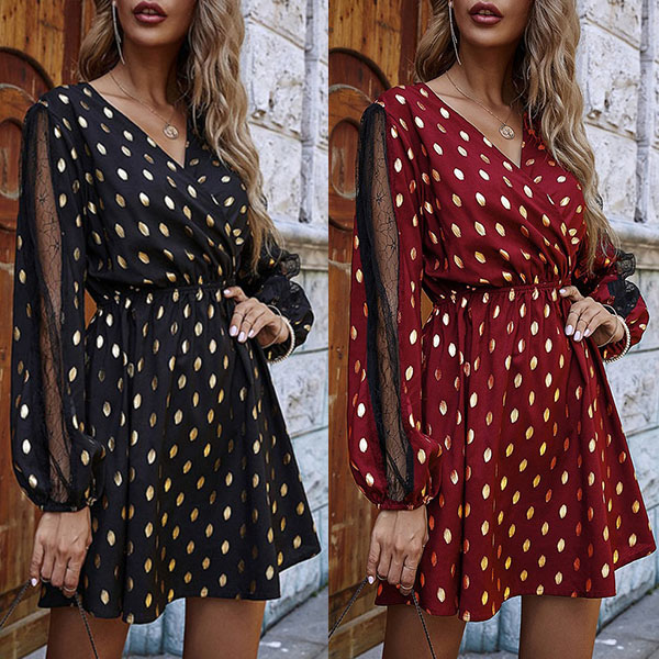 No matter for your daytime out or night dating,this dress can give you an easy transition. The v-neck and gauze spliced details at the sleeve part will further enhance your feminine appeal,while the dots printed details can offer you a more playful and eye-catching look. This dress makes it easy for any girl to look effortlessly charming and beautiful.