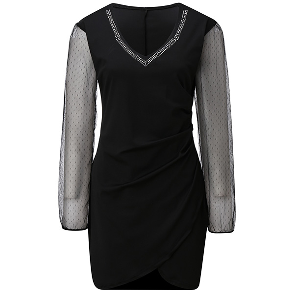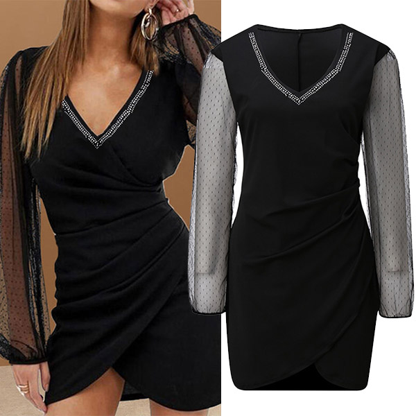 This dress is designed with v-neck and gauze spliced long sleeve,which can showcase your alluring side,while the irregular hem design will further enhance its charm. When invited to some night events and weekend gatherings,this dress can help you catch more eyes.