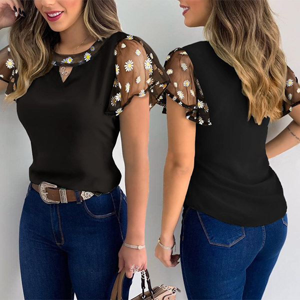 Not only can maintain the comfy,but also can bring you more style,that's why we suggest you this t-shirt! The gauze spliced lotus sleeve and daily pattern details make this piece full of style and charm. Attracted? Then invite it to your wardrobe!
