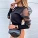 Sexy Gauze Spliced Puff Sleeve Round Neck Solid Color Top
