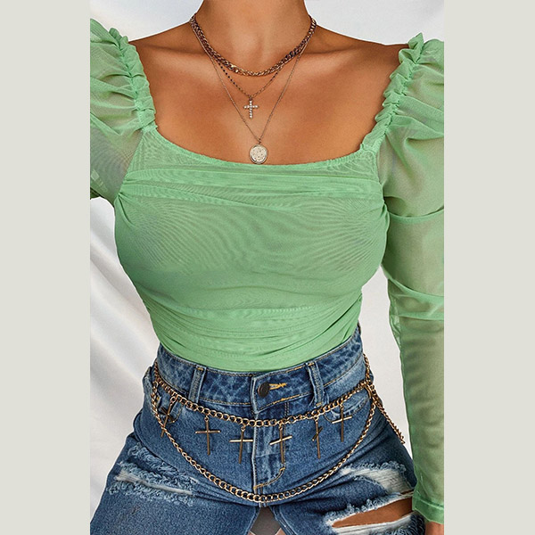 Your charming feminine appeal can have an instant boost when you dress yourself up with this wonderful top. Its alluring design details like puff sleeve,square collar and gauze spliced design make this piece look so attractive and flirty. Perhaps you can add a sparkle necklace if you wanna look more stunning!