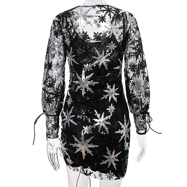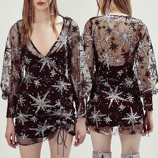 You can look extra stunning when slipping into this sequin dress. Its alluring design details like see-through gauze spliced,deep v-neck,irregular hem and puff sleeve design make this piece full of charm and style. Save one for your night events.