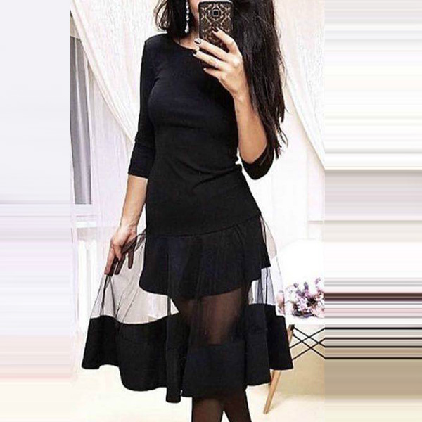 Sexy Gauze Spliced Ruffle Hem 3/4 Sleeve Round Neck Dress