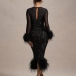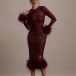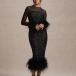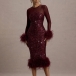 This stunning dress features a combination of gauze and sequin detailing that adds a touch of sophistication and sparkle to your look. The plush fabric along the cuff and hemline gives it a luxurious and cozy feel, perfect for a night out or special occasion.