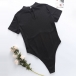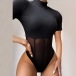 Sexy Gauze Spliced Short Sleeve Mock Neck Solid Color Bodysuit