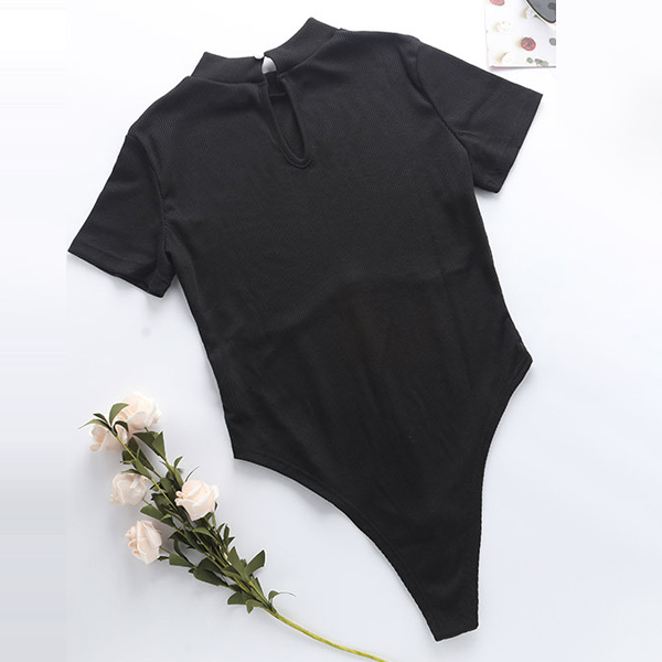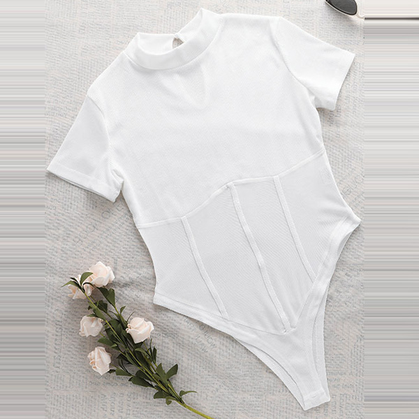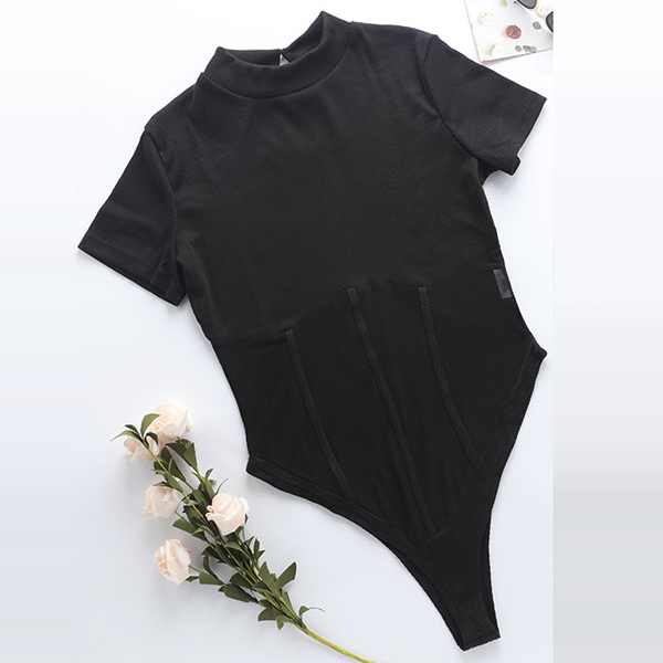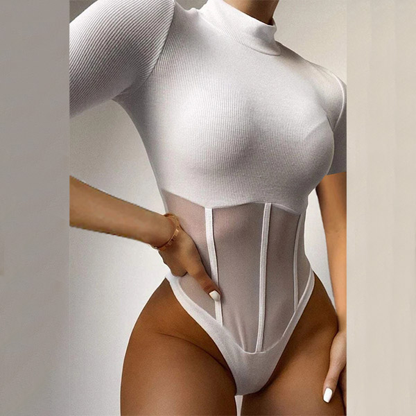 Hey,girls,you can trust in this bodysuit to be your secret weapon to flaunt off your sexy and seductive curve. Finished with short sleeve,mock and gauze spliced details,this piece not only can keep the comfy,but also can make you look more alluring. We suggest you matching with a high waist bottom to achieve for a flirty look!
