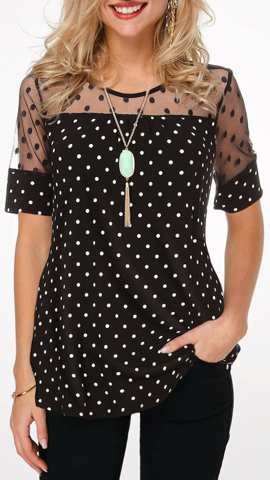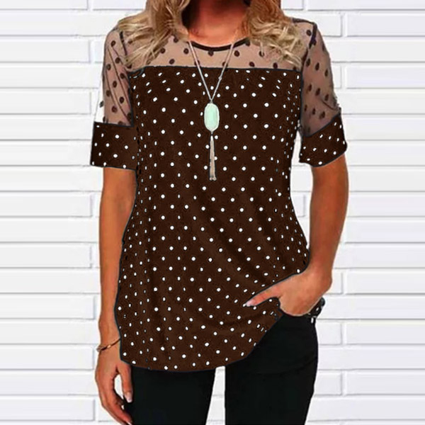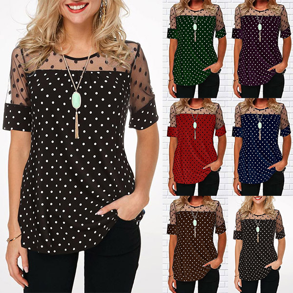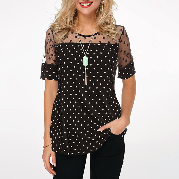 Combines of stylish and flirty vibes,this t-shirt is worth to arouse your attention. The gauze spliced details will make this piece look more attractive,while the dots printed details will lend you a dash of playful vibes. No matter matching with a shorts,skirt or jeans,you can look fashionable enough!