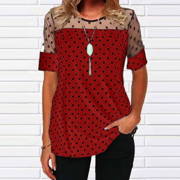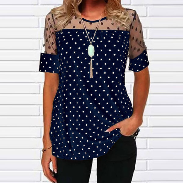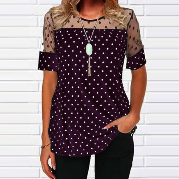 Sexy Gauze Spliced Short Sleeve Round Neck Dots Printed T-shirt