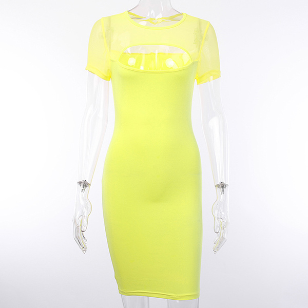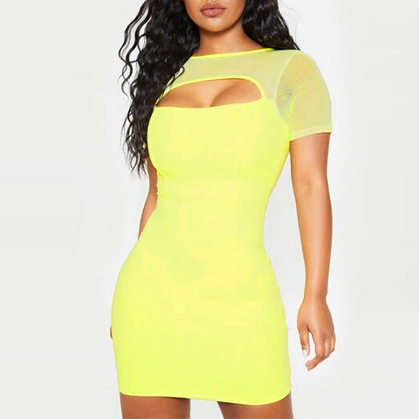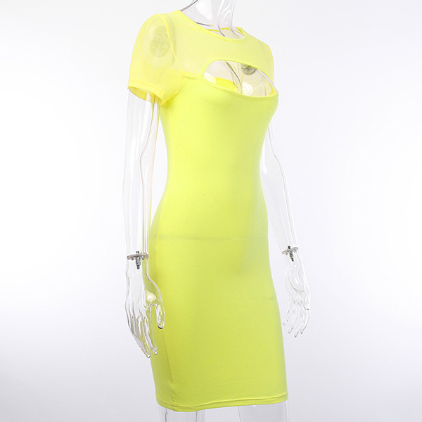 Sexy Gauze Spliced Short Sleeve Round Neck Slim Fit Hollow Out Dress