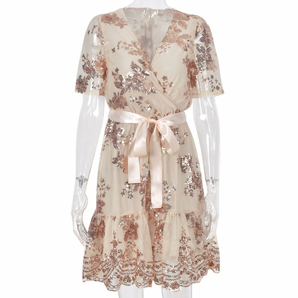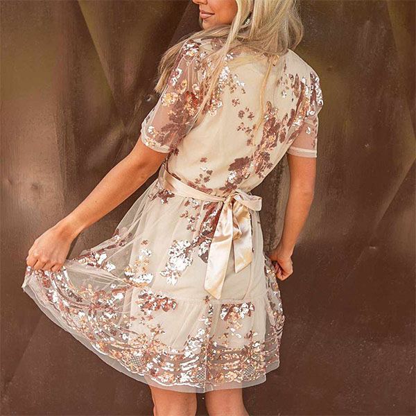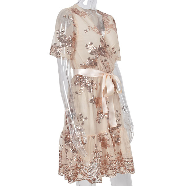 Sexy Gauze Spliced Short Sleeve V-neck High Waist Sequin Party Dress