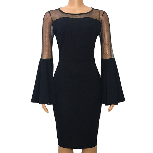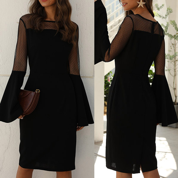Look exceptionally stunning when you slip into this dress. Comes with a classic yet flattering black tone,with a fit silhouette design,which can better highlight your slender figure. Moreover,the gauze spliced and trumpet sleeve design will further enhance its charm. Save this wonderful dress for the parties and gatherings.