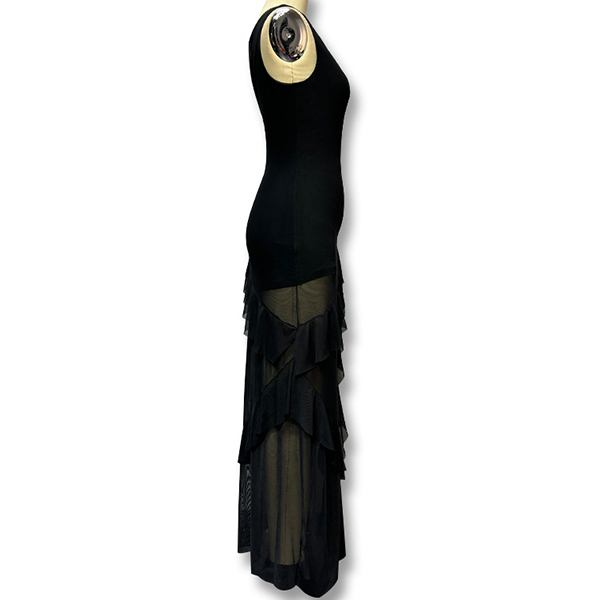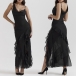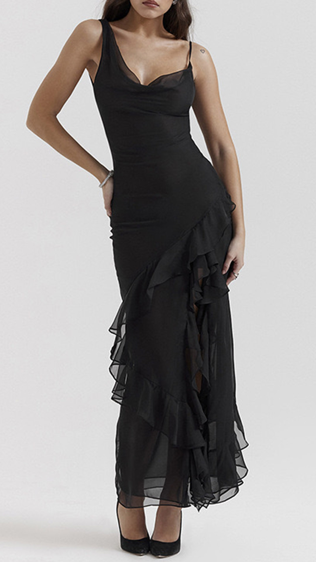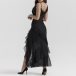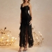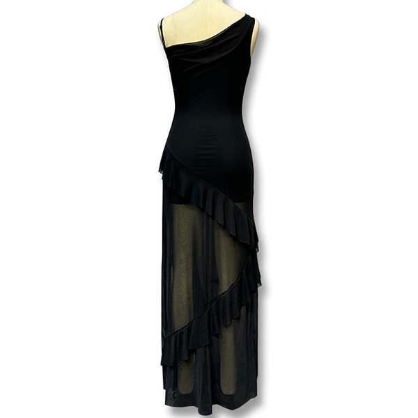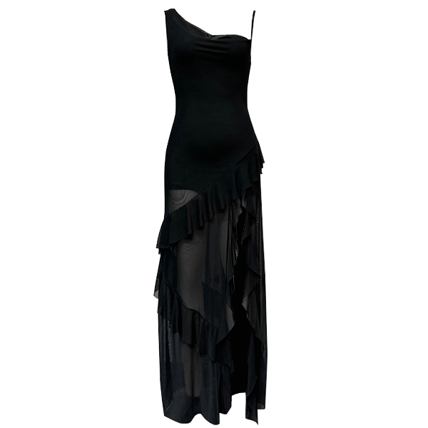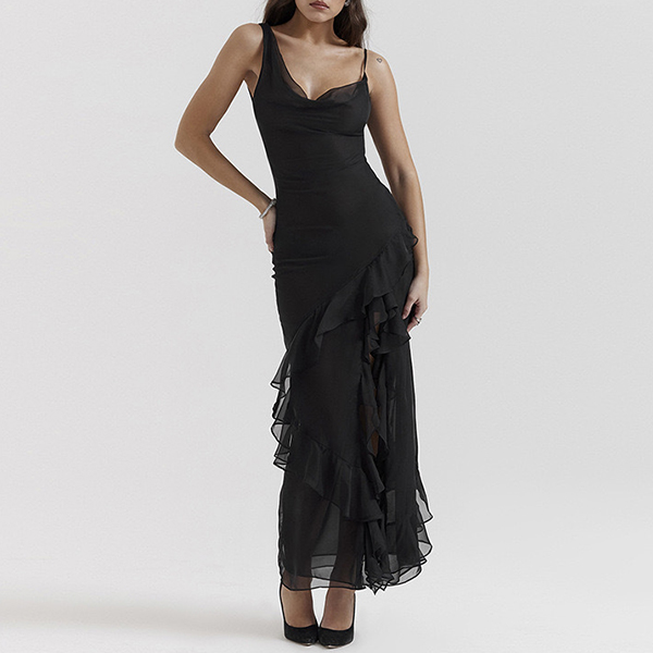 This captivating party dress features a seductive V-neckline, alluring gauze splicing, and elegant ruffle details, creating a head-turning, glamorous look. Pair this dress with strappy high heels and statement earrings for a glamorous look.