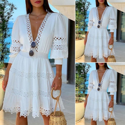 When you go out with this dress,you can easily arouse more attention. The v-neck and hollow out lace spliced design will make you look sultry and flirty. Finished with half sleeve and high waist design,this dress also can showcase your slender figure. For your night dating and weekend out,this dress can be your wise choice.