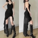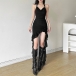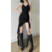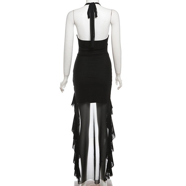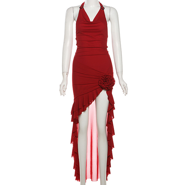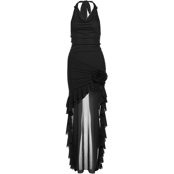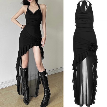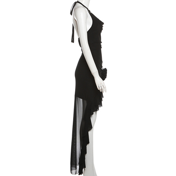 This black dress features a halter neck design, sleeveless silhouette, 3D floral embellishments, backless detail, ruffle accents along the irregular hemline. It is perfect for special occasions and events.