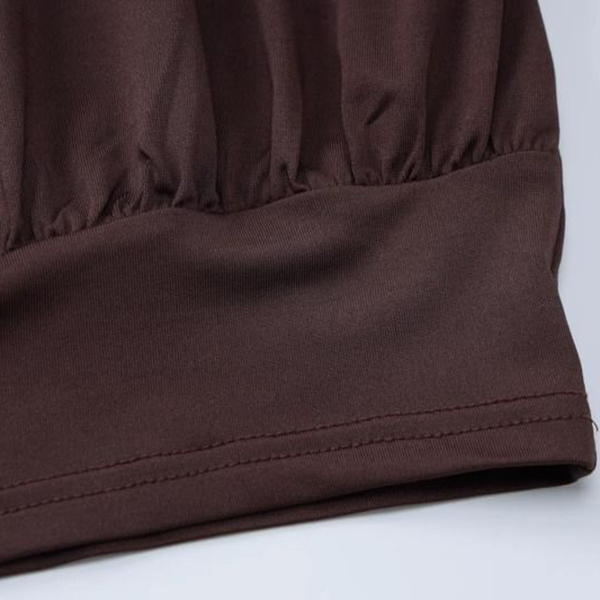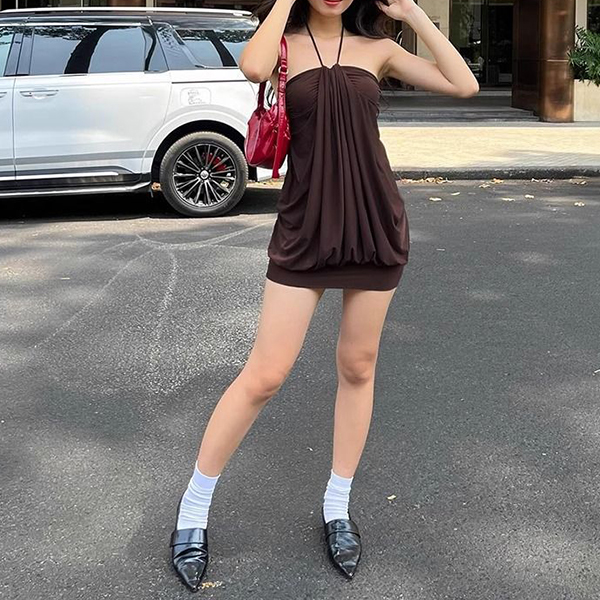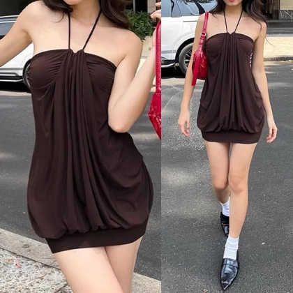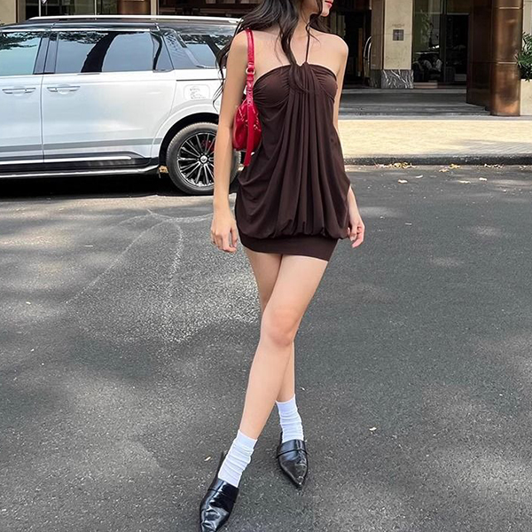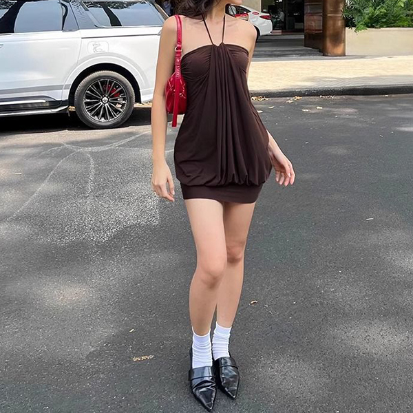 Embrace effortless Y2K nostalgia with this striking chocolate brown mini dress. Designed to turn heads, this piece features a delicate halter neckline that leads into a beautifully ruched center, creating a cascade of fluid draping. The unique "bubble" silhouette offers a relaxed, voluminous fit through the body before cinching elegantly at the hem. Crafted from a soft, lightweight fabric, it moves with you, making it the perfect choice for warm summer nights, rooftop parties, or a stylish date night.