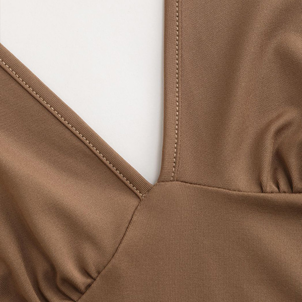 Wow, a sexy dress! The key features that make this dress stand out are the halter neckline, the plunging V-neck, the backless design, and the irregular hemline. For a night out on the town, pair the dress with strappy heels, statement earrings, and a sleek clutch.