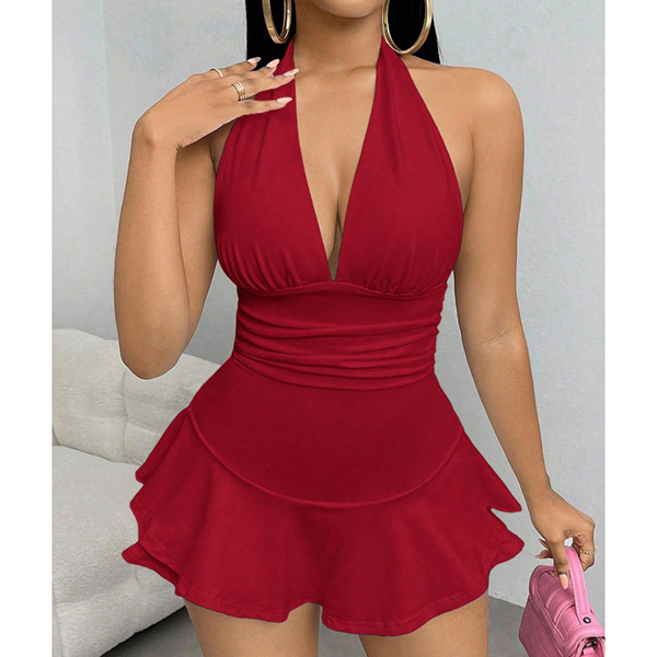 This captivating romper features confident halter neck styling with elegant V-neck construction and dramatic backless design for contemporary bold elegance. I like the ruffle hemline design, and you?