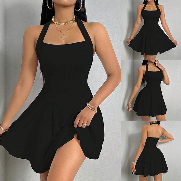 This mini black dress features a halterneck design with a backless detail for a sexy and glamorous look. It is perfect for a night out, a cocktail party, or a special occasion.