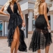 This black lace dress features a captivating halter neckline, a plunging v-neck, a daring backless design, and high-low hemline creating a sultry and eye-catching silhouette.