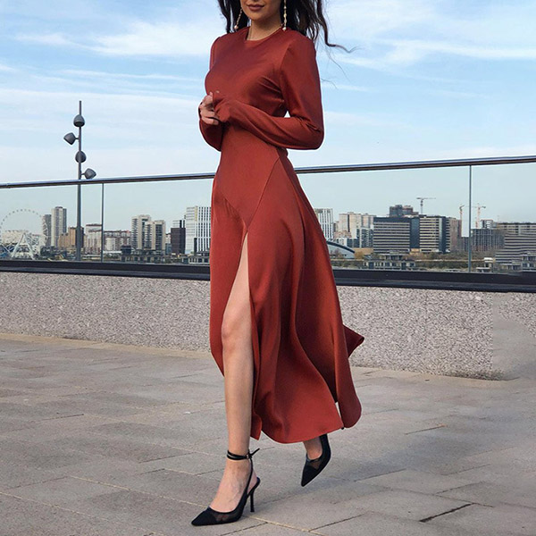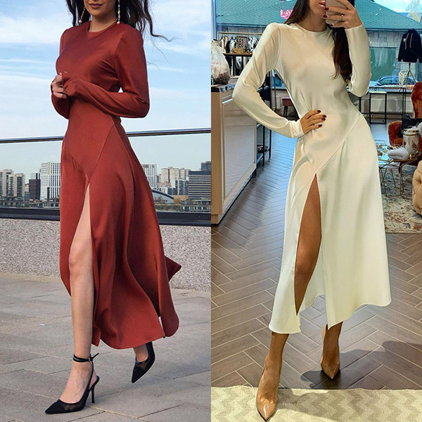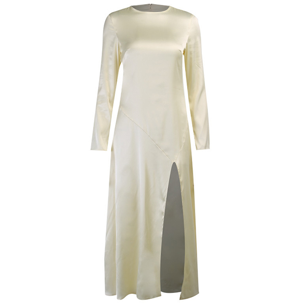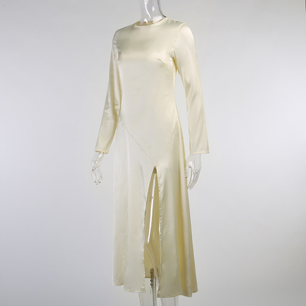 Sexy High Slit Hem Long Sleeve Round Neck Solid Color Dress
