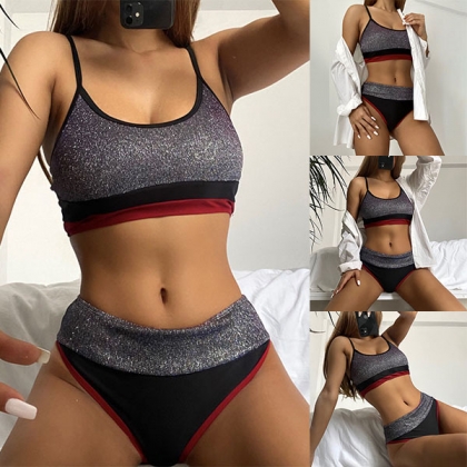Sexy High Waist Contrast Color Shinning Bikini Set