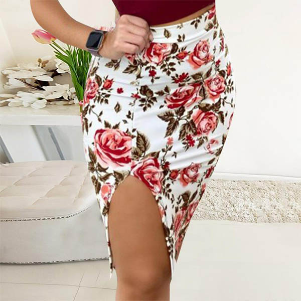 This skirt features chic and eye-catching printed details,which can easily help you win more eyes. Finished with high waist,slit hem and a fit silhouette,this piece can flaunt off your seductive hips and slender figure. You can match with a crop top to have a sexy and flirty look.