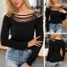 Sexy Hollow Out Boat Neck Long Sleeve Slim Fit T-shirt