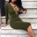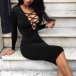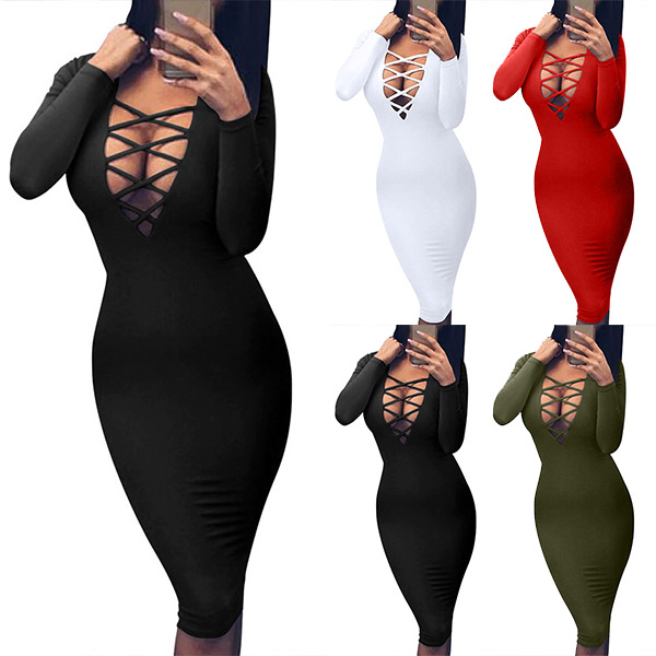 Sexy Hollow Out Deep V-neck Long Sleeve Solid Color Tight Dress