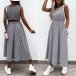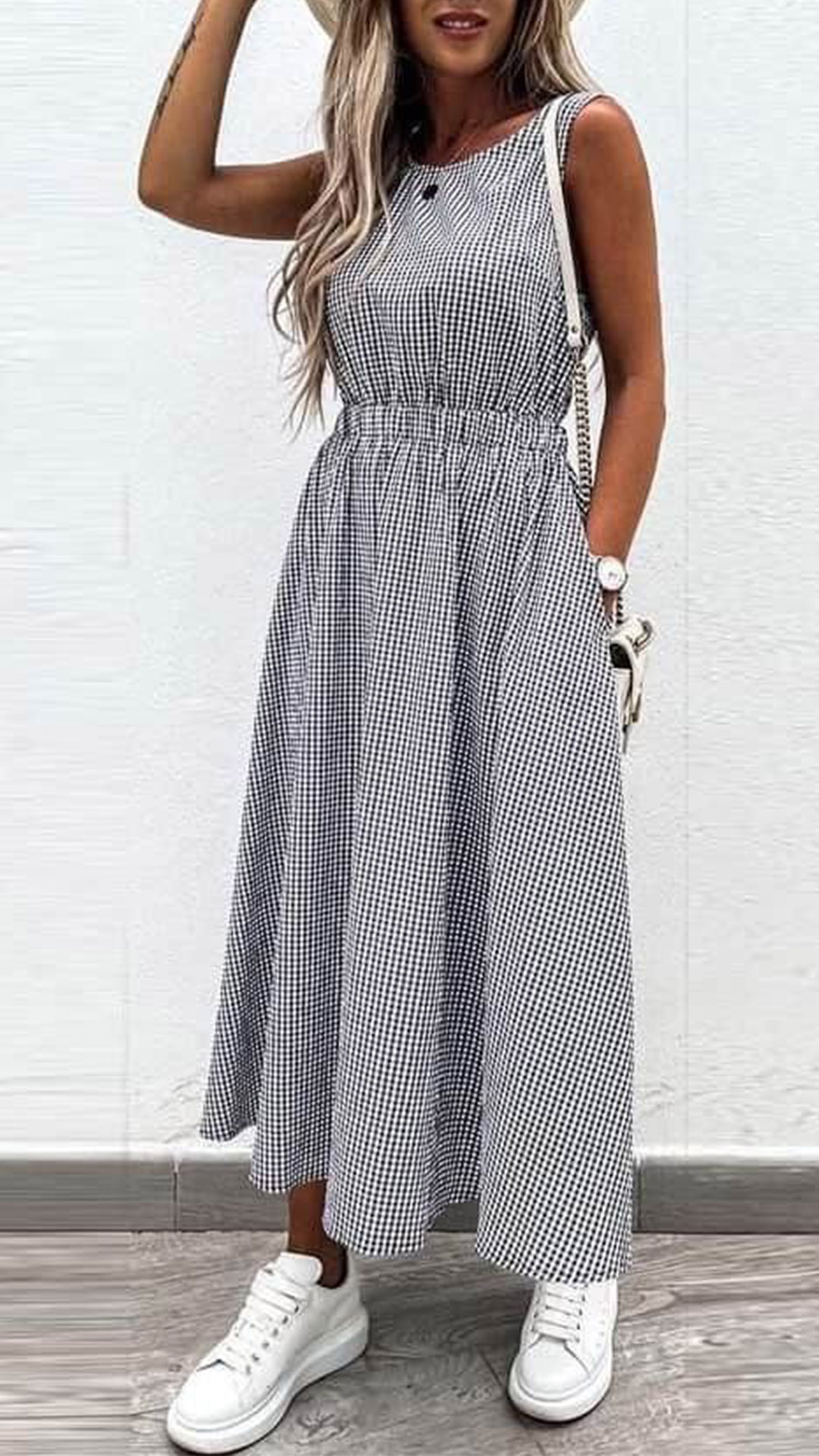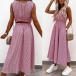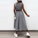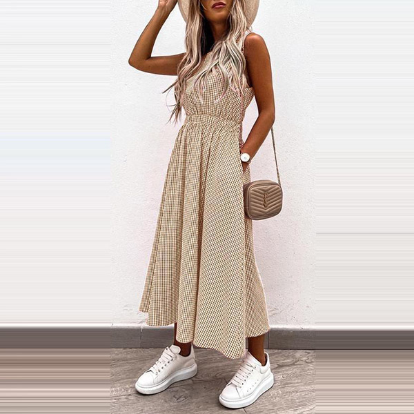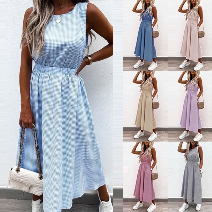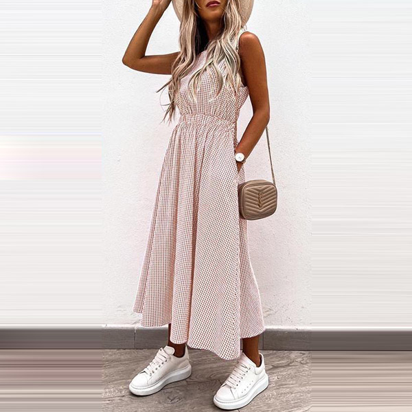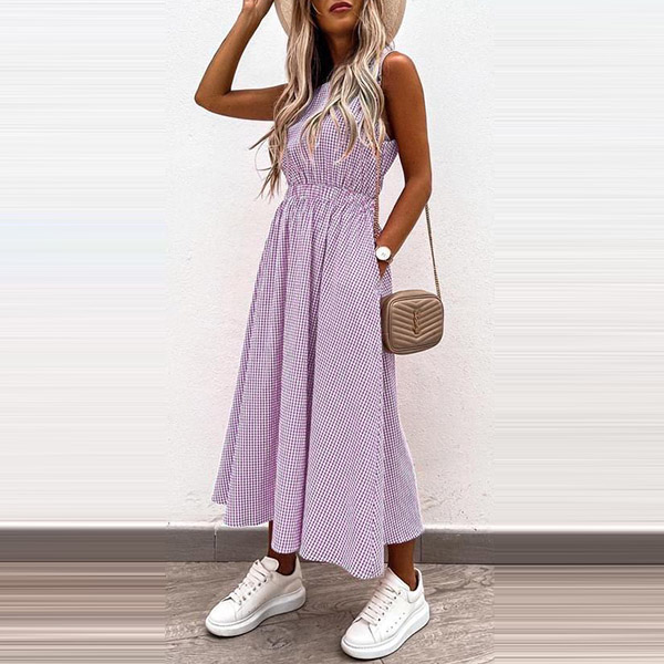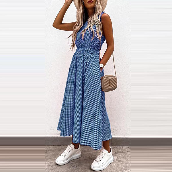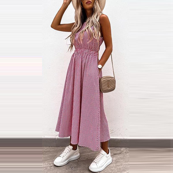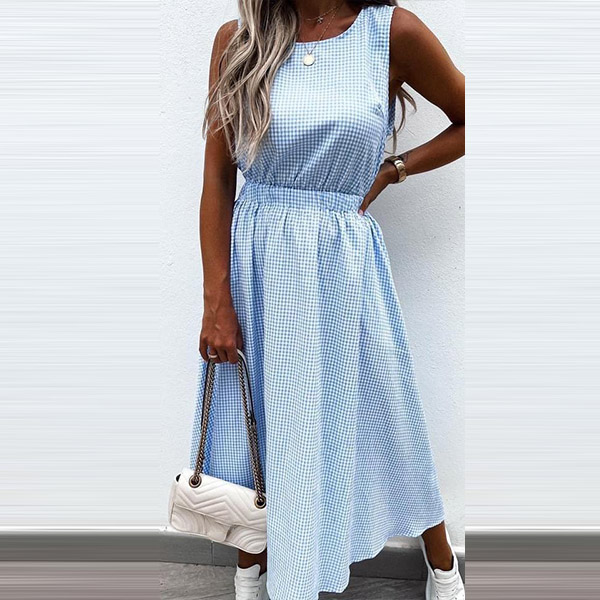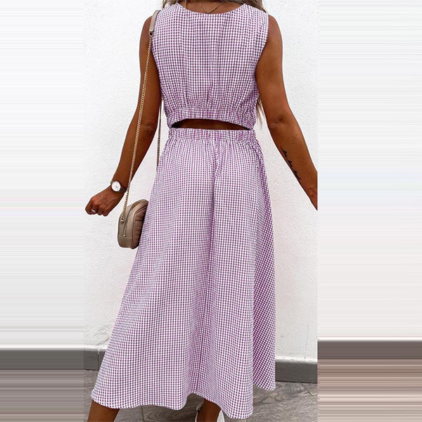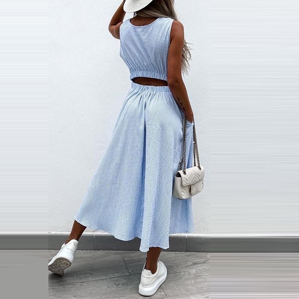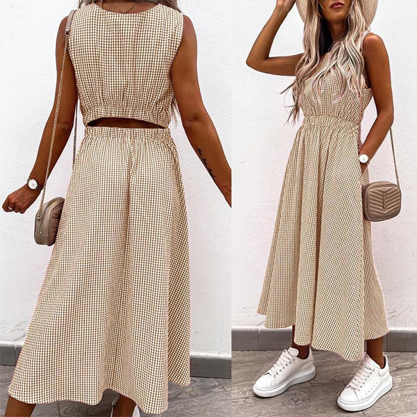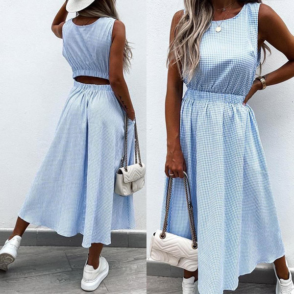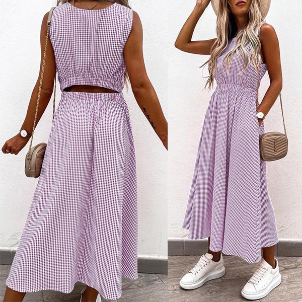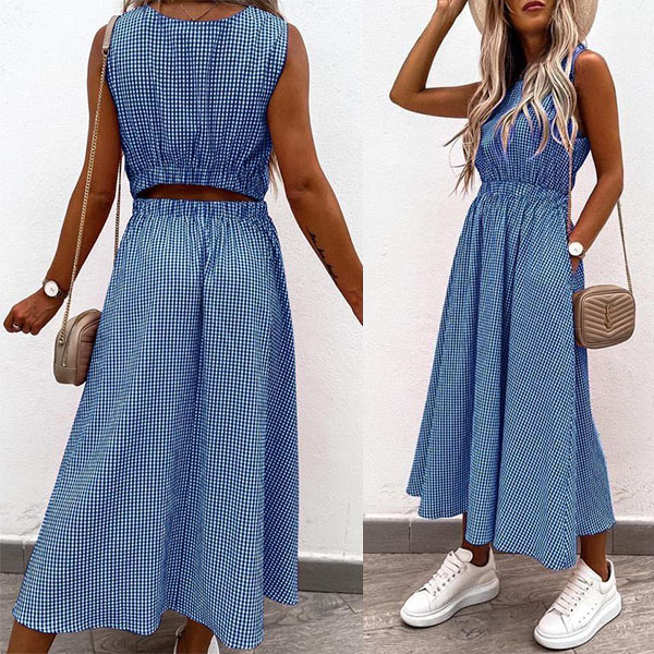 Sexy Hollow Out High Wais Sleeveless Round Neck Plaid Dress
