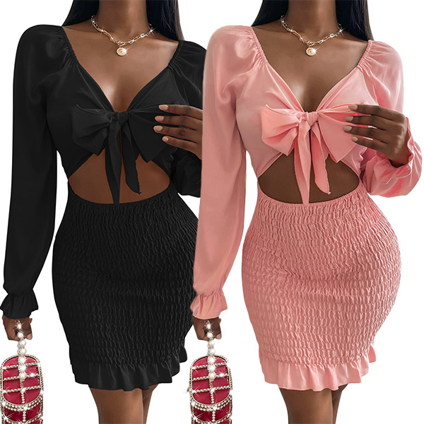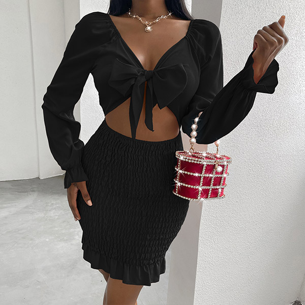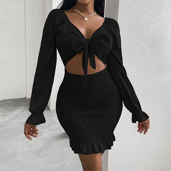 Sexy Hollow Out High Waist Knotted V-neck Slim Fit Ruffle Hem Slim Fit Dress