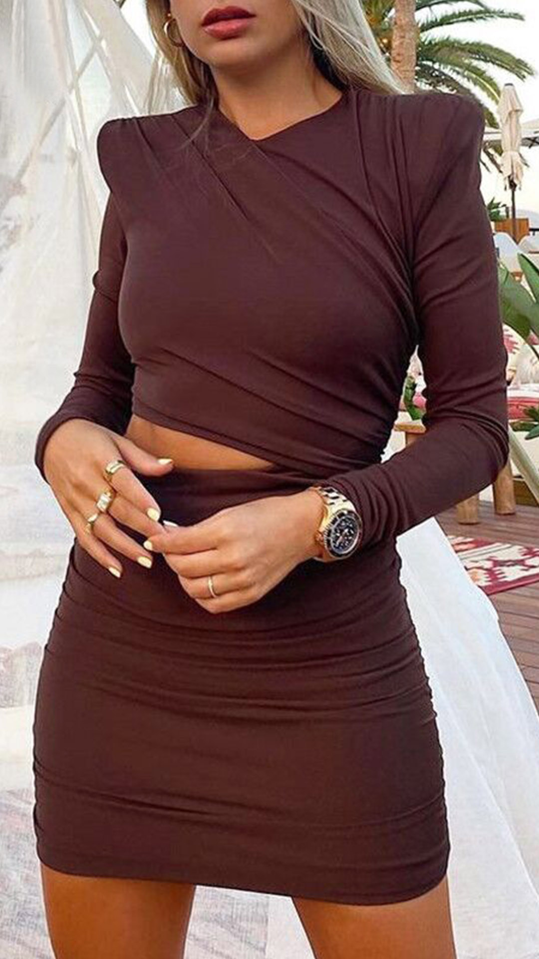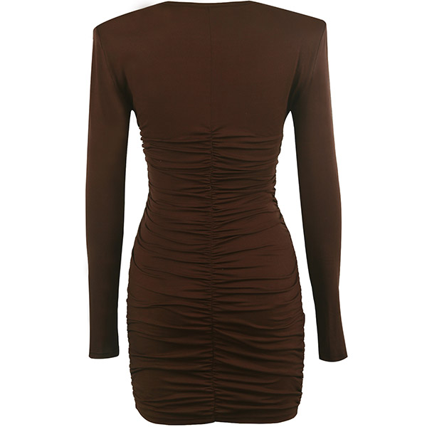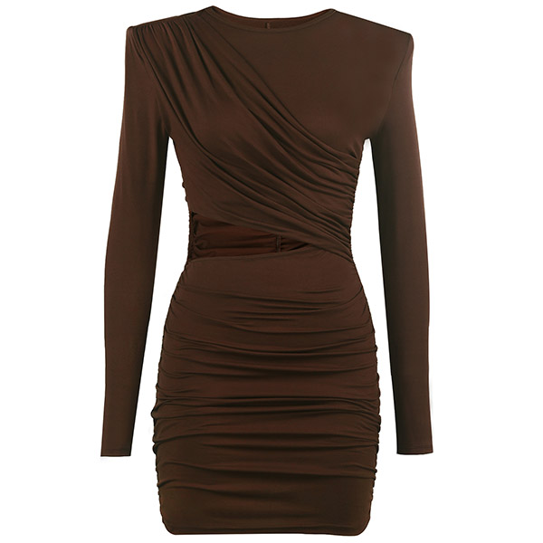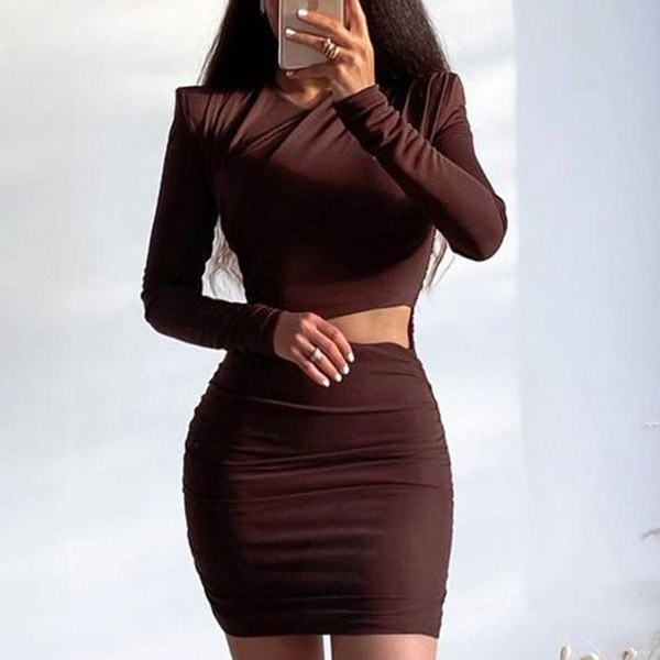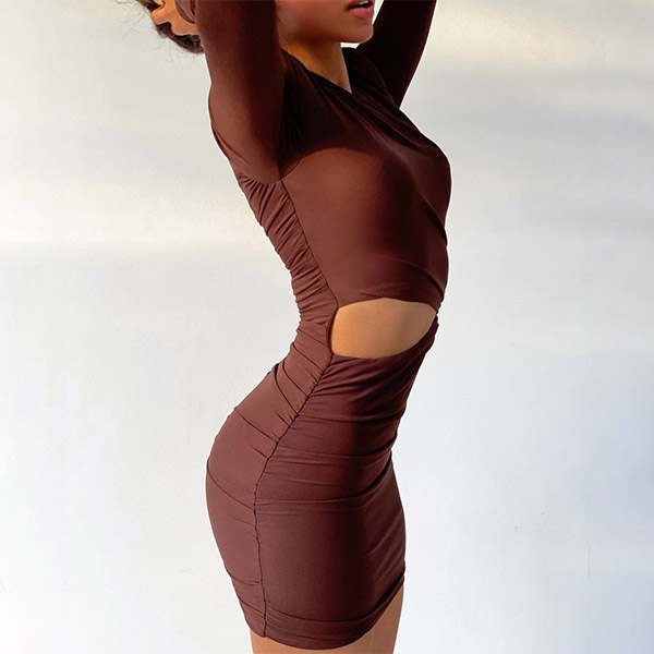 This dress comes with a solid color,finished with long sleeve,round neck and a fit silhouette,which can better portray your seductive curve. What's more,the hollow out high waist and wrinkled details can offer you a more alluring look. Just save this piece for your night events.