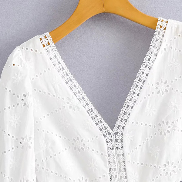 Sexy Hollow Out High Waist Ruffle Hem Deep V-neck Hollow Out Lace Dress